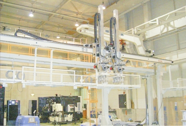 This equipment transports workpieces to be processed overhead on mass production parts processing lines. It consists of a horizontal axis and a vertical axis, and is installed above processing machines to maximize the available space on the floor.