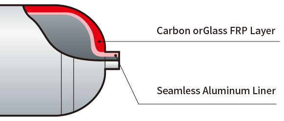 ULTRESSA is an ultralight pressure cylinder with a structure in which a seamless cylinder (liner) made of metal such as aluminum alloy or resin is used as an inner cylinder, and the outer side is wrapped in multiple layers with high-strength fibers such as carbon fiber impregnated with epoxy resin and glass fiber. In the worst case scenario, to avoid a rupture, the liner would allow the gas inside to leak first, to safely lower the internal pressure within a specially designed structure (Leak Before Break structure).