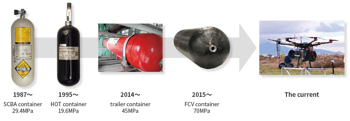 ULTRESSA is a composite material container sold by Teijin Engineering Limited. It originates from Japan's first composite material container introduced by Teijin Limited in 1987 from SCI (Structural Composites Industries), a pioneer of FRP composite material containers in the United States. The number of domestic shipments has now exceeded 400,000 units. Due to their excellent lightweight property, FPR composite material containers are used in a wide range of fields, including air respirators for firefighting, medical oxygen applications, and hydrogen-related applications. For hydrogen-related applications, they are mainly used as a hydrogen supply source for hydrogen fuel cells. Our portfolio ranges from small to large, and has a track record of being installed in hydrogen fuel cell drones and FCVs. Currently, we have a lineup of not only SCI-manufactured but also domestically manufactured containers, making it possible for us to provide ULTRESSA products that meet the needs of our customers.
