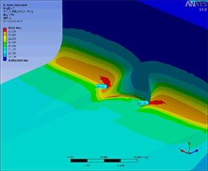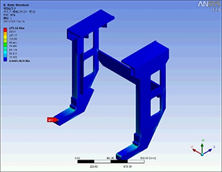 例えば重量1.0トンのワークをつかむため、製作するハンド各部の強度について、通常の強度計算の後、万全を期してCAE解析を実施。