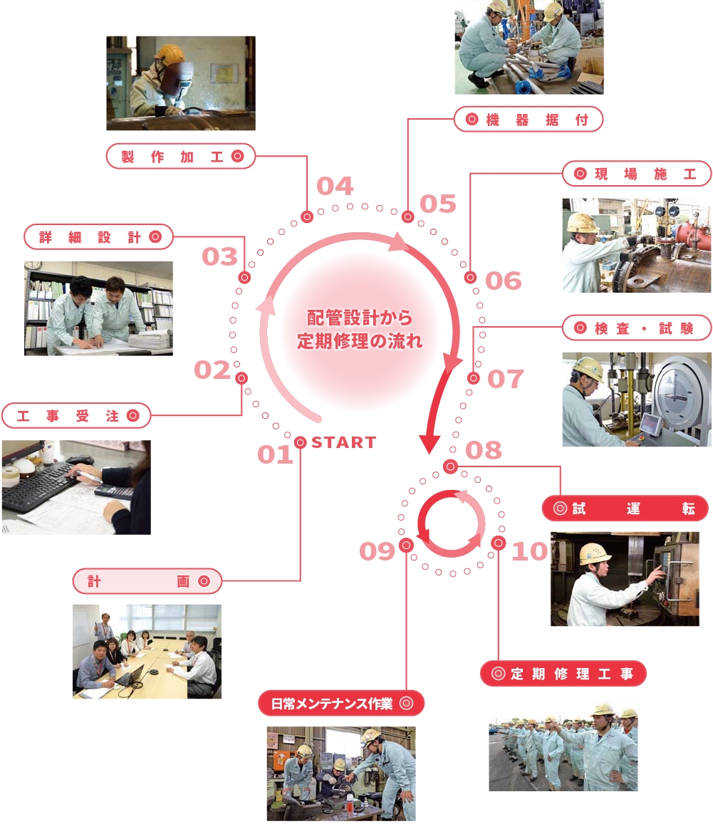 - 設計、施工及び設備稼働後の日常保全、定期修理工事まで、一貫したエンジニアリング業務を提供
