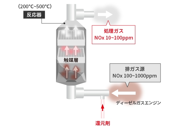 船舶排ガス中に含まれるNOx(窒素酸化物)除去のために、還元剤を使用し、触媒作用による反応で無害な窒素と水に分解します。