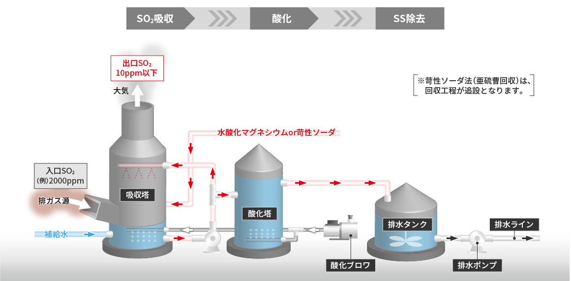 ボイラーや工業排ガス中に含まれ、大気汚染防止法による規制物質であるSOx(硫⻩酸化物)を吸収液(水酸化マグネシウム・苛性ソーダ)で装置内にて吸収し、SS(懸濁物質)除去後排液として固定放流、または回収する装置です。